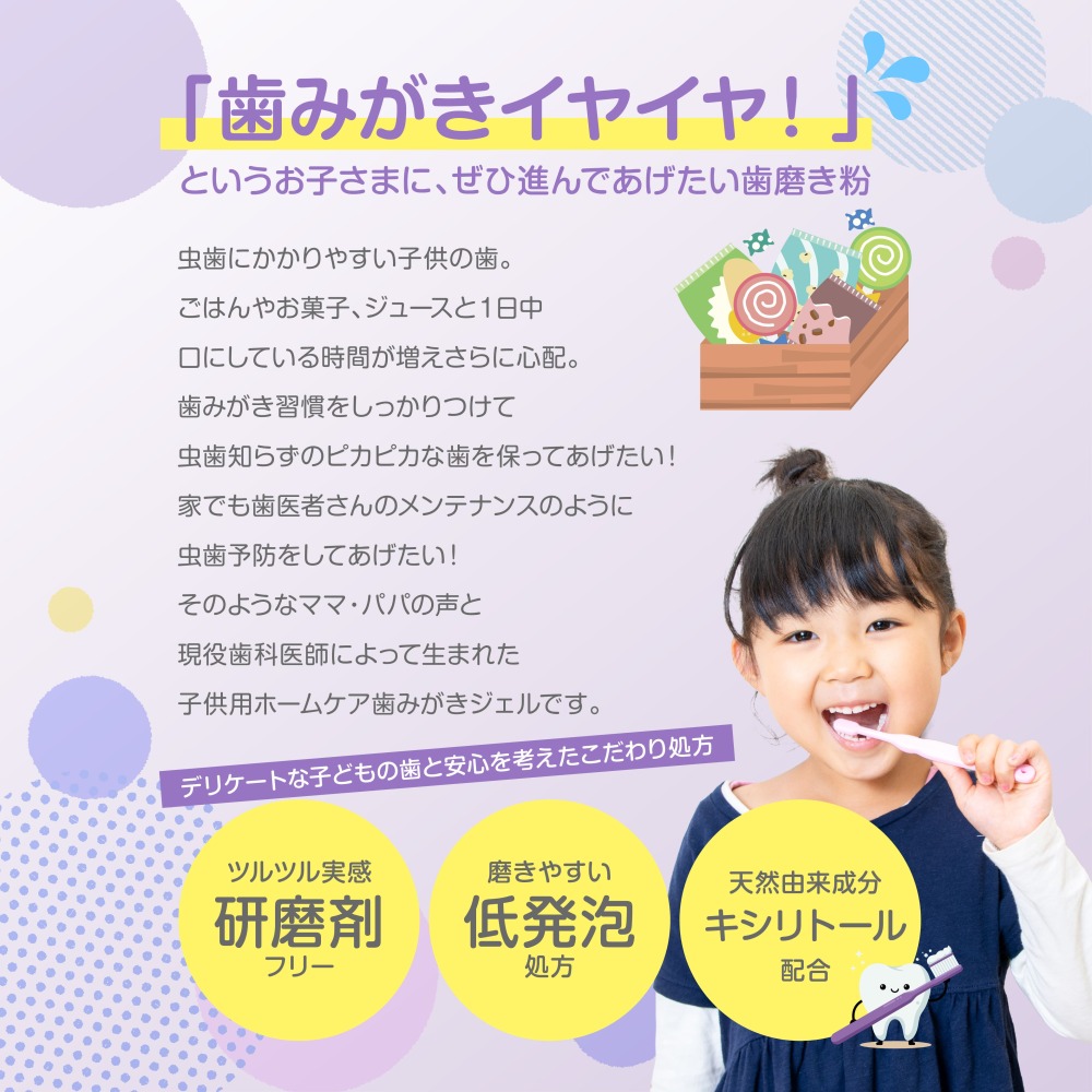 お子さまの歯磨き粉によく使われる甘味料「キシリトール」を配合 。 やさしい甘さで、お子さまが嫌がらずに楽しく歯磨きを続けられます。■POINT3