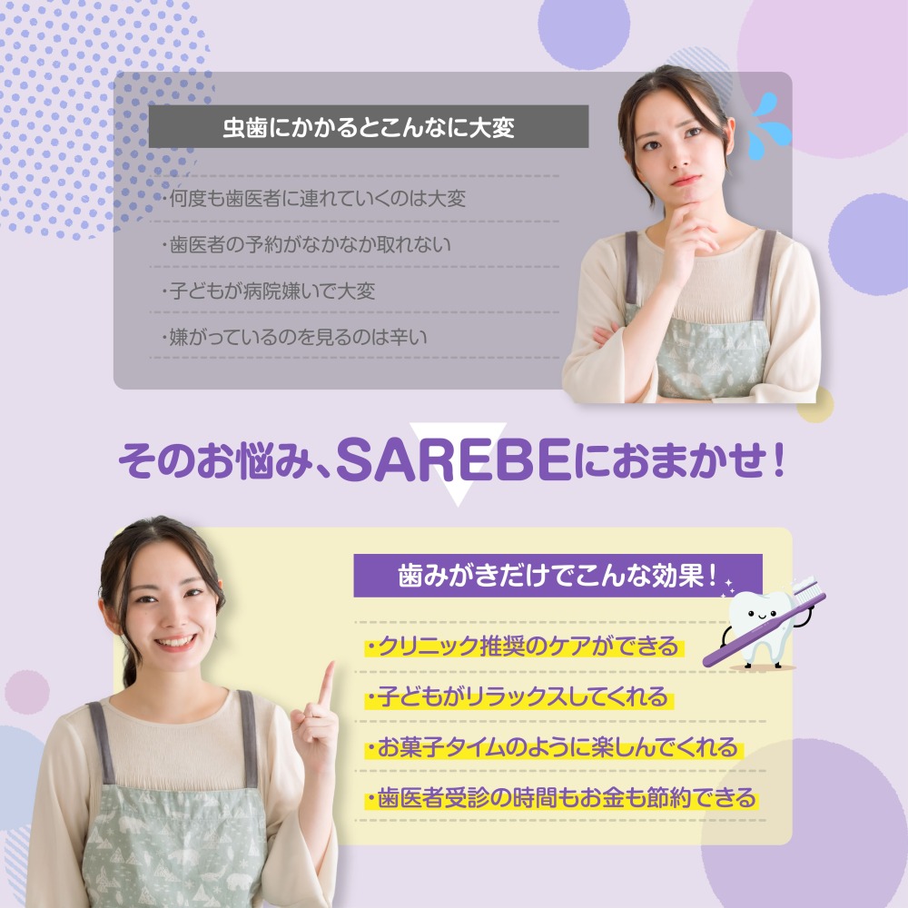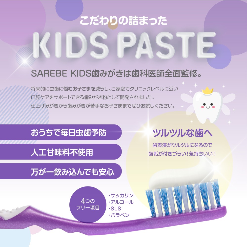 ぶどうフレーバーでミントの清涼感が苦手なお子さまにもおすすめ!フィンランド産キシリトール配合の子ども用歯みがきジェル SAREBEキッズは、デリケートなお子さまの「お口の環境」を守り育てるキッズ歯みがきペーストです。 毎日の歯みがきで、お子さまのお口の健康をサポートする成分を厳選して配合しました。