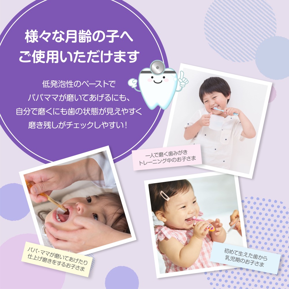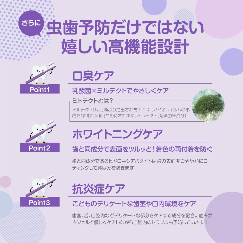 歯ぐきとお口の環境を守る成分(湿潤剤)として、「グリセリン」や「ソルビトール」のほか、 「グリチルリチン酸2K」「ミルエキス」など、合計6種類も配合 。 デリケートなお子さまのお口をすこやかに守ります。■POINT5